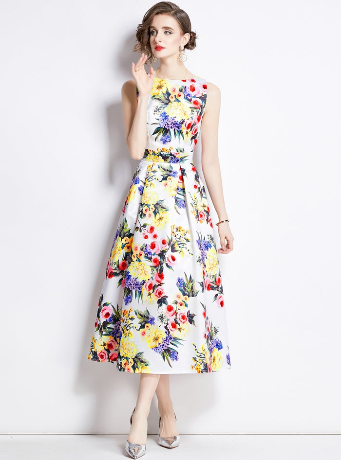 Harnessing the elegance of a flourishing garden, this exquisite sleeveless dress is a canvas of vibrant hues and detailed floral patterns, offering an air of refined grace for any upscale event. A subtle boat neckline sets a sophisticated stage, leading down to a precisely fitted bodice that flares gently into a luxurious full skirt, showcasing the botanical print in full splendor. The cinched waist is accented by a sleek belt, creating a silhouette that celebrates the feminine form. Expertly crafted, each seam and stitch is designed to add a textural depth that complements the visual feast of the florals. Perfect for a day at the races or a spring wedding, this dress promises to be the centerpiece of your ensemble, pairing flawlessly with understated accessories to let its natural beauty shine.