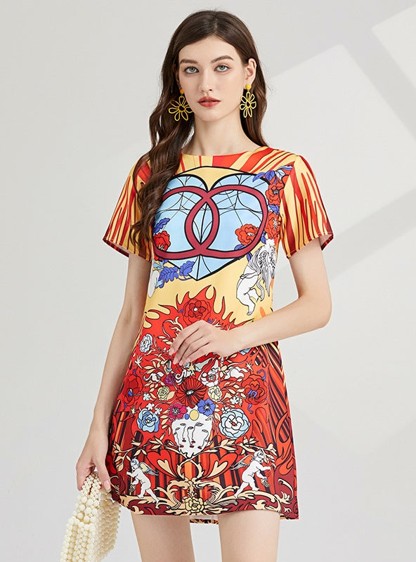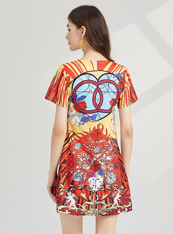 Carnival of Hue: This vibrant, stained glass-inspired dress is a wearable piece of art, flaunting a bold palette of red, yellow, and blue, intermingled with striking patterns that catch the eye. The short-sleeve design, coupled with the A-line silhouette, offers a casual yet flattering fit that moves with grace and ease. It's a piece that celebrates color and creativity, making it a perfect choice for those who love to stand out in a crowd. The kaleidoscopic patterns are not just visually compelling but also tell a story of eclectic taste and an appreciation for design that transcends the ordinary. Style this dress with minimal accessories to let its vividness speak for itself, or pair with bold, statement jewelry to amplify its artistic expression.