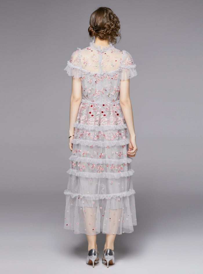 Round Neck Lotus Leaf Short Sleeve Perspective Gauze Dress