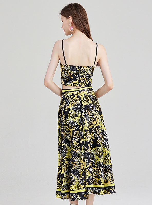 Delve into a world of baroque elegance with this exquisite two-piece dress. The cropped bustier top seduces with its sculpted, sweetheart neckline and ruched detailing, offering a tantalizing glimpse of skin while providing ample support. Golden chain embellishments drape delicately, adding a touch of opulence to the jet-black canvas. Below, the skirt unfolds in a dramatic display of ornate, gold-on-black patterns, reminiscent of royal tapestries of yore. The high-waisted A-line cut is both flattering and functional, allowing for a comfortable fit that moves with grace and fluidity. Each swirl and curl of the pattern is meticulously placed to create a visual feast, cascading down to a midi-length hem that sways with every step. This ensemble is a bold statement piece for the modern woman who carries a love for timeless luxury and unapologetic femininity in her heart.