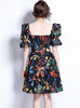 Bubble Sleeve Square Collar High Waist Print Dress