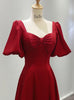 Burgundy Satin Puff Sleeve Pearls Prom Dress