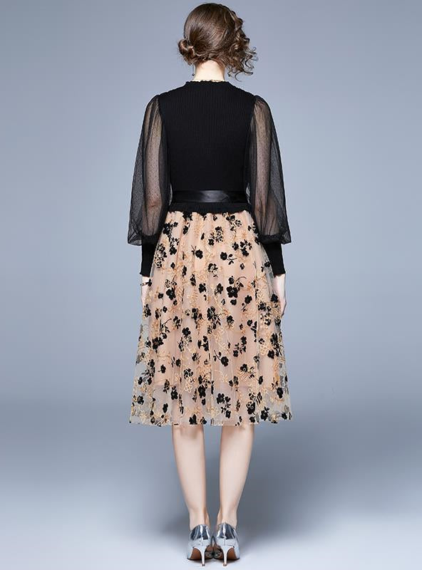 Embroidered Floral Bubble Sleeve Mesh Dress
