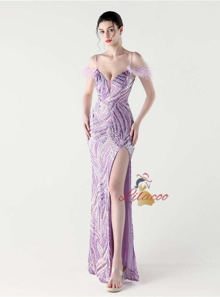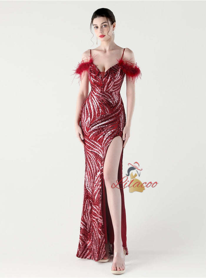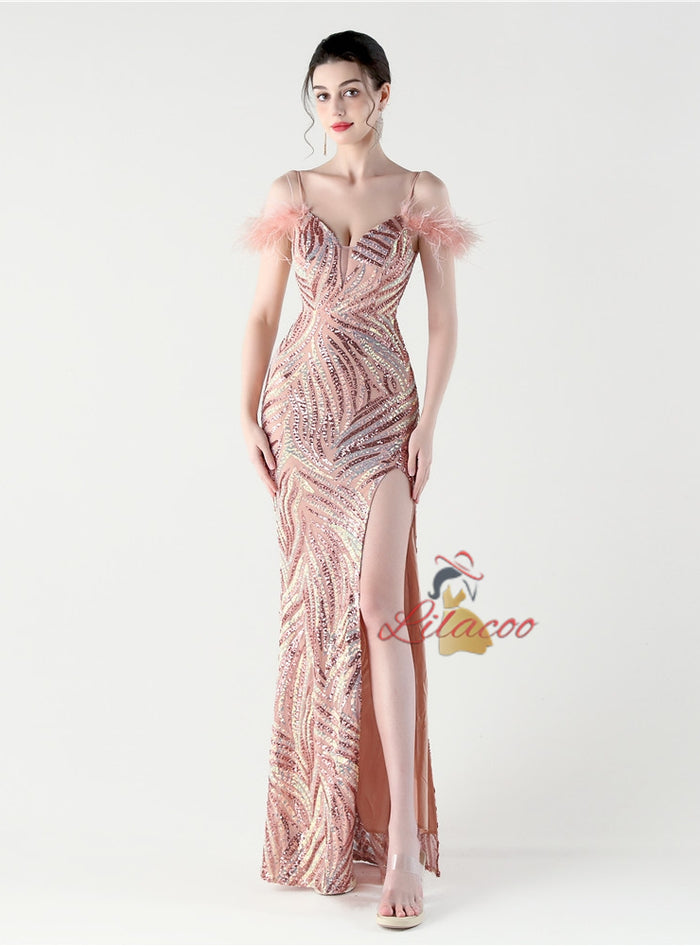 Memraid Sequins Spaghetti Straps Feather Split Prom Dress