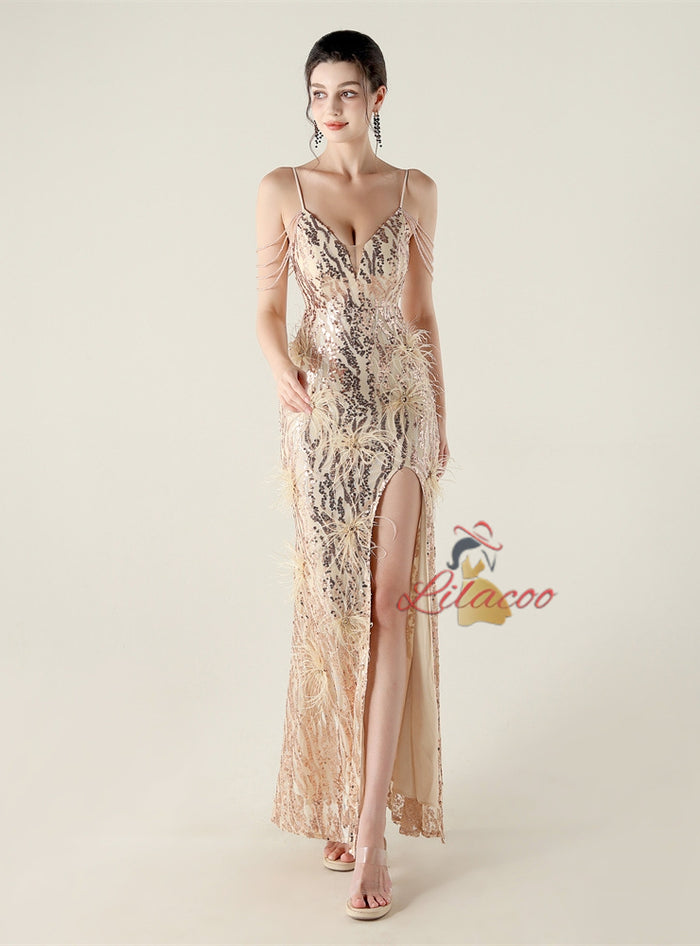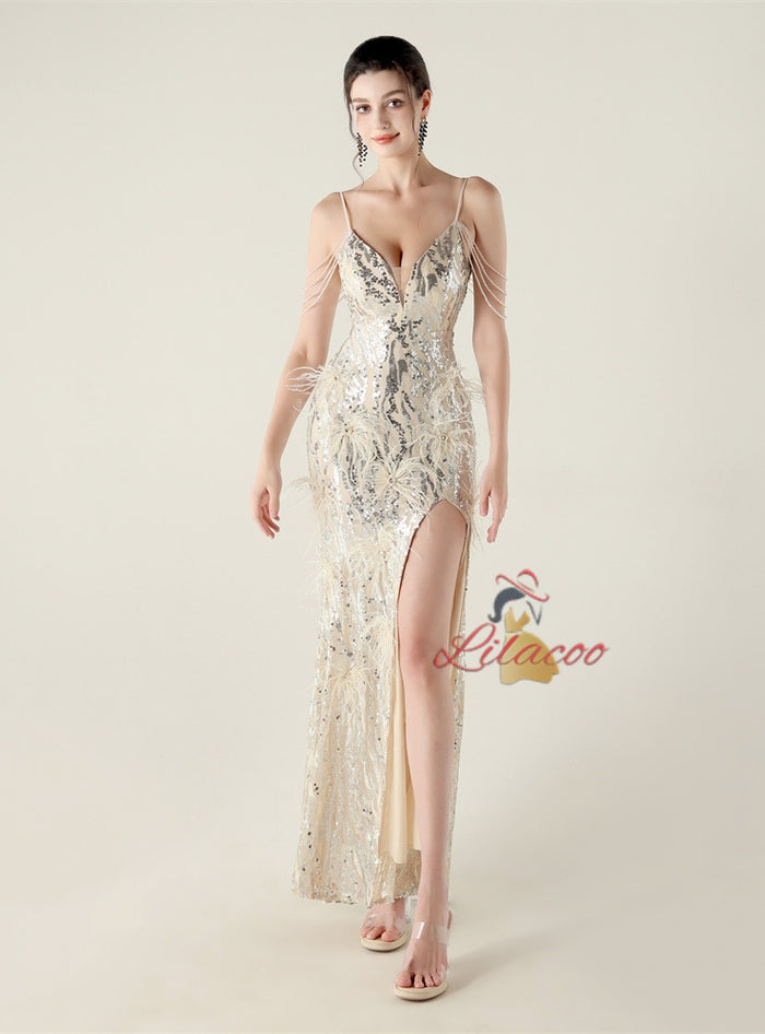 Mermaid Sequins Spaghetti Straps Feather Prom Dress