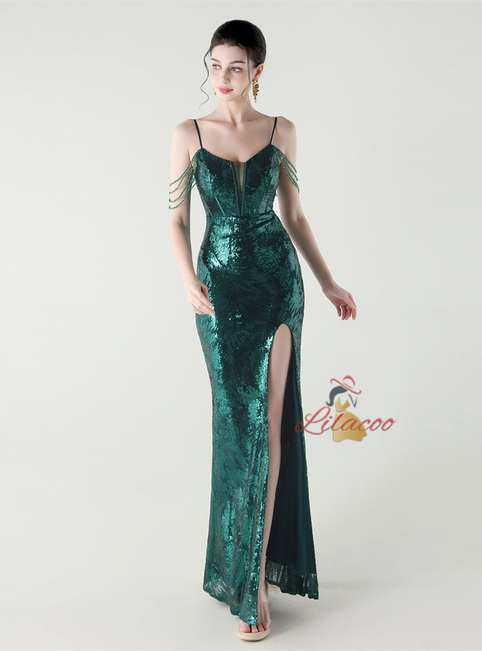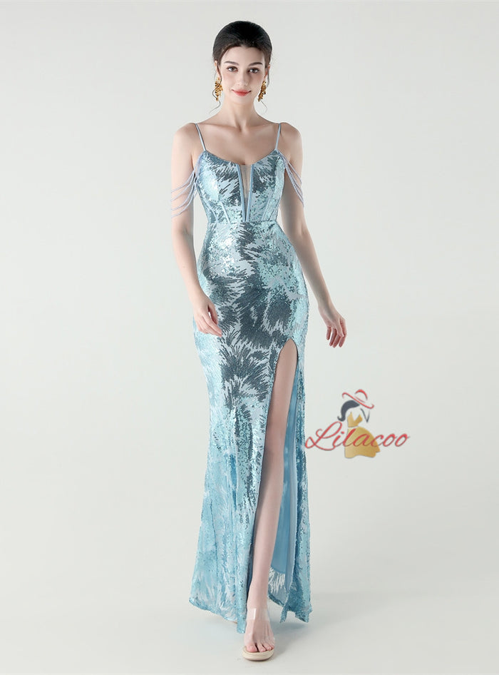 Mermaid Sequins Spaghetti Straps Split Beading Prom Dress