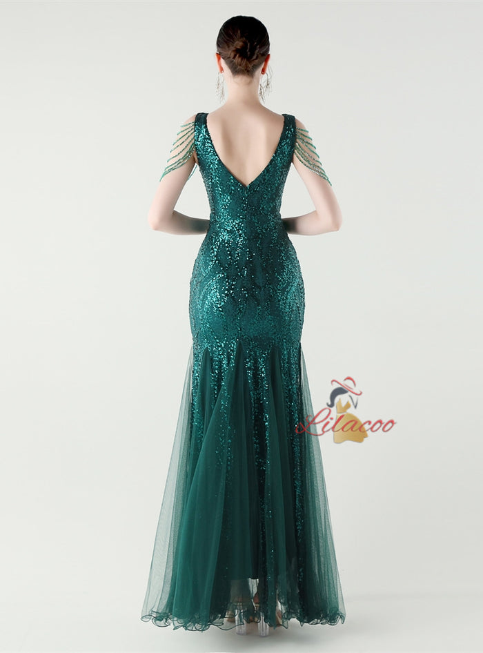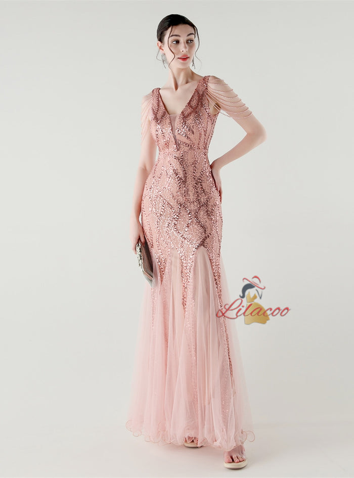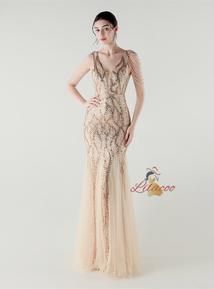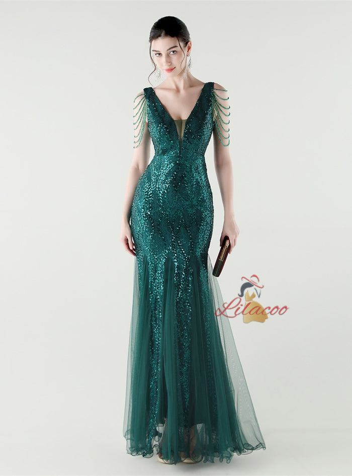Mermaid Sequins Tulle V-neck Beading Prom Dress