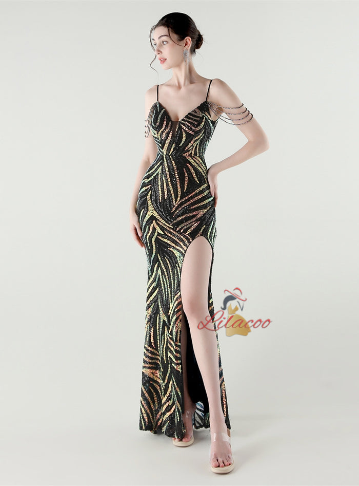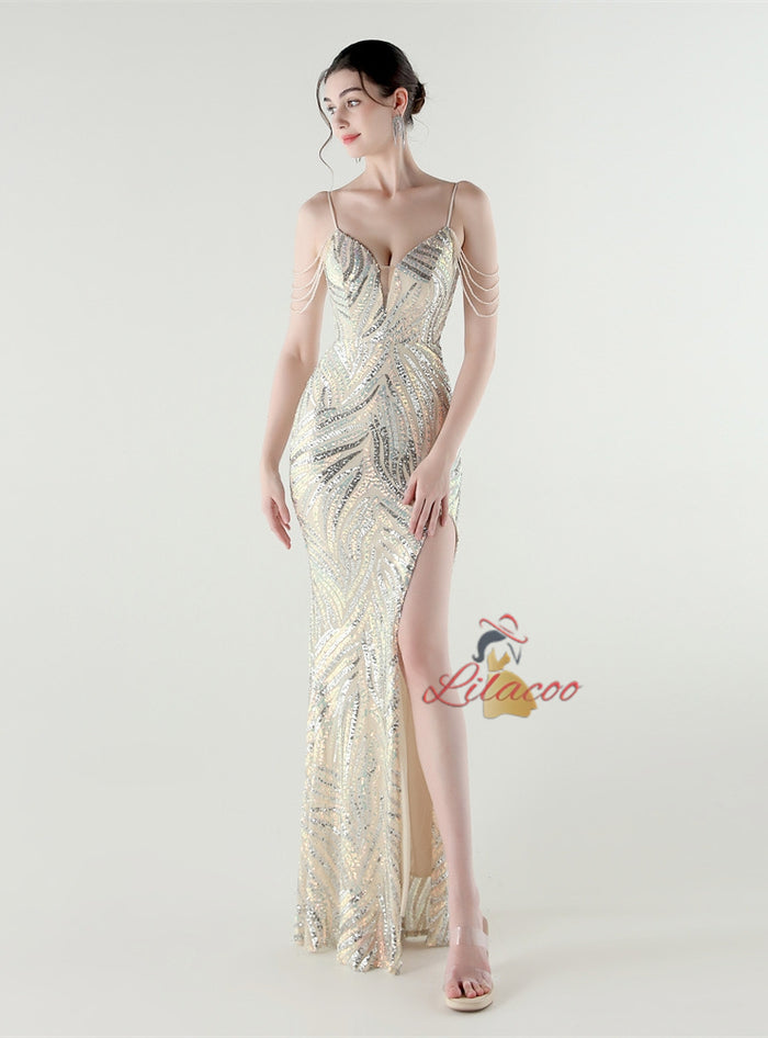 Mermaid Spaghetti Straps Sequins Split Beading Prom Dress