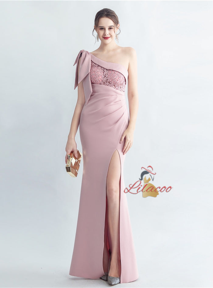 One Shoulder Split Pleats Lace Prom Dress