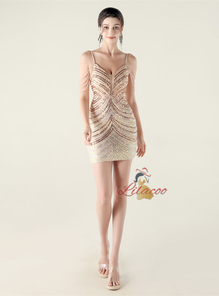 Spaghetti Straps Sequins Beading Short Prom Dress