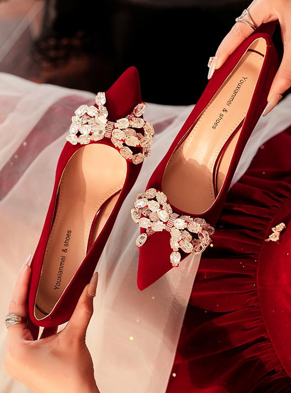Divine elegance radiates from these stunning heels, ideal for those who seek a blend of luxury and functionality. The deep burgundy color is rich and captivating, providing the perfect backdrop for the sparkling brooch that adorns the toe. The metallic block heel not only adds a modern twist but ensures balance and comfort for prolonged use. Made from premium materials, the suede-like texture offers a smooth, sophisticated touch. Designed for versatility, these heels can effortlessly transition from day to night. Whether you're walking down the aisle or attending a gala, these heels will leave a memorable impression. The pointed toe and sparkling details combine to create a refined look that speaks of understated opulence. Let these heels complete your ensemble with grace and poise.