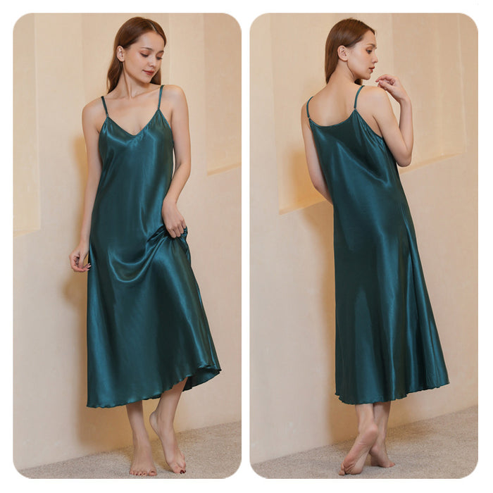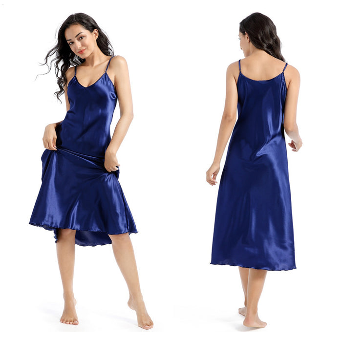 Feeling luxurious is easy with this beautiful deep blue satin nightgown. The rich satin fabric is not only visually stunning but also feels incredibly smooth and soft against your skin. This nightgown features adjustable spaghetti straps that allow for a customizable fit, ensuring you feel supported and comfortable all night long. The V-neckline and flowing A-line silhouette create a graceful and feminine look, making this piece a standout in any sleepwear collection. The lightweight satin material allows your skin to breathe, keeping you cool and comfortable during warm nights. Whether you're unwinding after a long day or enjoying a peaceful morning at home, this nightgown promises to make you feel elegant and pampered. Elevate your sleepwear collection with this exquisite satin nightgown and experience the perfect blend of luxury and comfort. Treat yourself to the beauty and elegance of this stunning nightgown and enjoy the ultimate in nighttime relaxation.