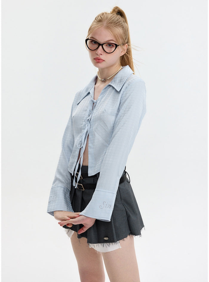 Cultivate your wardrobe with this fresh take on the classic button-down shirt. This light blue t-shirt offers a fusion of tailored sophistication and playful charm with its front tie-up detail. The soft, breathable fabric ensures comfort and a relaxed fit, while the subtle texture adds depth to the minimalist design. The shirt's cropped length makes it an ideal partner for high-waisted skirts or pants, making it a versatile choice for both work and weekend wear. It's a garment that doesn't just speak of fashion but whispers tales of effortless elegance and carefree spirits.