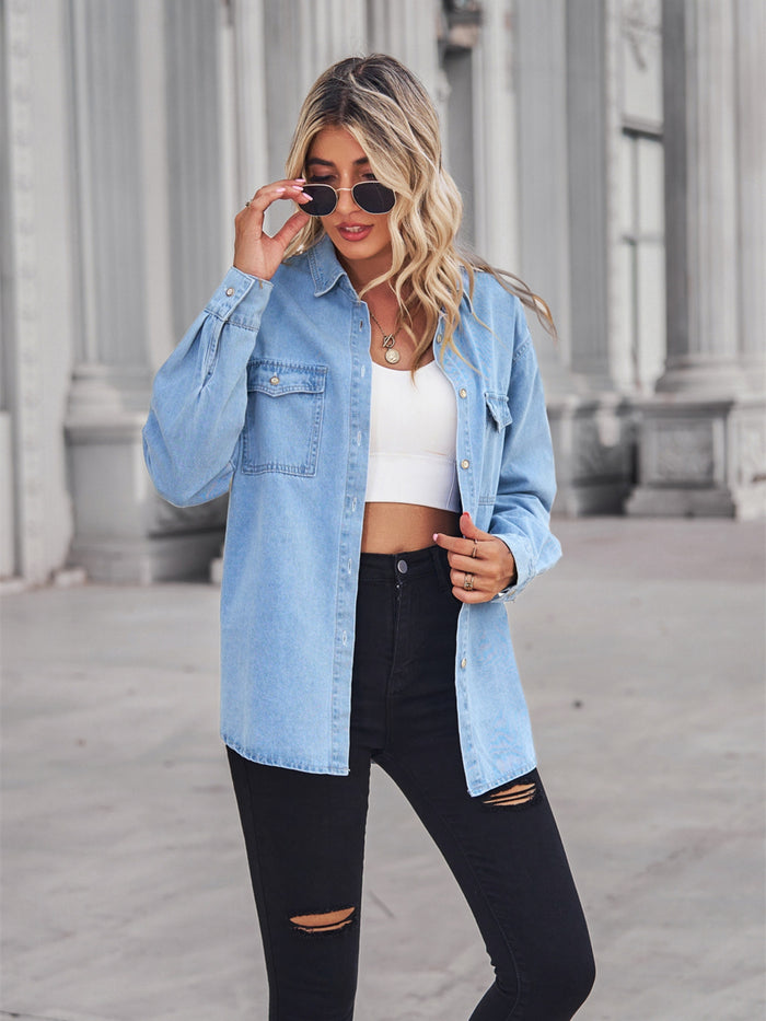 Craft unforgettable memories in the effortlessly stylish Lilacoo Serene Light Denim Long Sleeve Shirt for Women! This chic shirt is fashioned from a light-colored, thin denim fabric, perfect for casual outings and leisurely moments. It features a unique design, blending classic style and ultimate comfort.