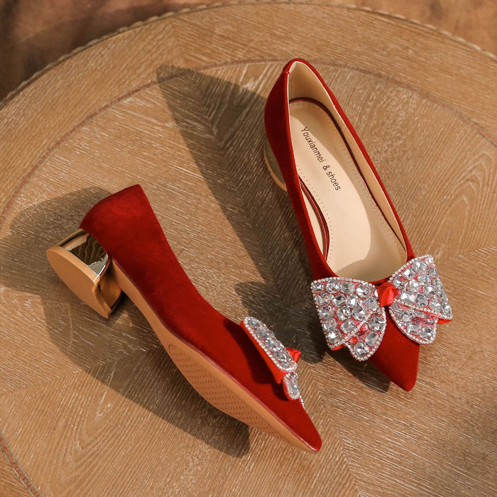 Eternally elegant and eye-catching, these red velvet heels are designed to make a statement at any event. The deep, rich velvet texture adds a sense of luxury, while the embellished bow on the front exudes glamour. The small block heel with a reflective golden finish not only elevates your style but also offers superior comfort, making them perfect for long hours of wear. Whether you're attending a holiday party, a wedding, or a formal dinner, these heels ensure you walk in confidence and style. Their bold red hue makes them the perfect accessory to any evening outfit, instantly transforming your look into something unforgettable. The pointed toe design elongates your legs, providing a sleek, sophisticated finish that flatters any figure.