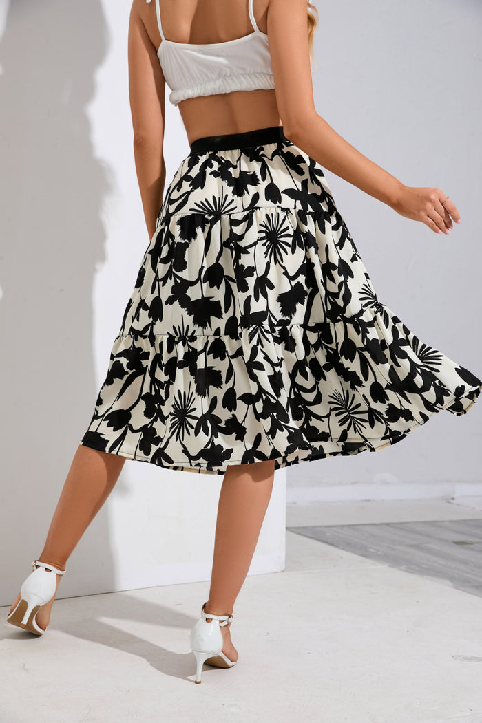 The Floral Print Midi Skirt is an elegant piece that will make you feel like a blooming flower. The skirt's high fitted waist accentuates your curves and flatters your figure, while the A-line silhouette and side slit add a touch of elegance and movement to the piece. The lightweight woven fabric is perfect for a summer day, and the ditsy floral print in red, yellow, and green adds a playful and feminine touch. To style this skirt, pair it with a white crop top and strappy sandals for a chic and effortless look that's perfect for brunch or a day out with friends.
