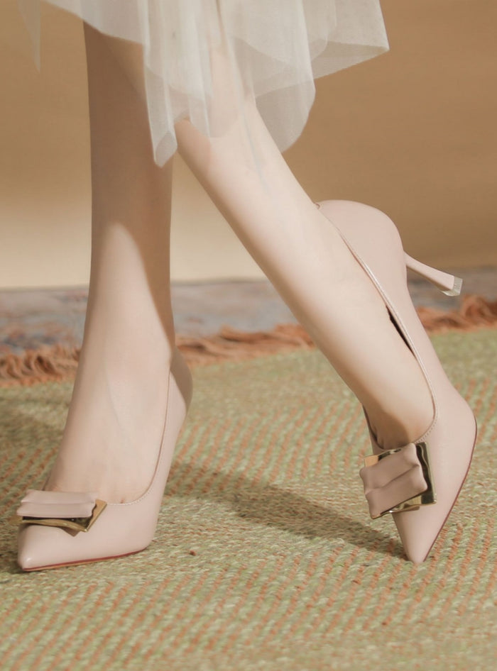 Familiar yet fresh, these stiletto heels are designed to exude elegance with a modern twist. The soft, neutral shade of the material allows them to pair effortlessly with a variety of outfits, making them versatile enough for formal events or an elevated casual look. The standout feature of these heels is the layered rectangular embellishment at the toe, offering a contemporary flair while maintaining a sophisticated air. The slender stiletto heel adds height, enhancing your silhouette without compromising on comfort. Crafted with attention to detail, these heels provide both style and practicality, allowing for confident wear throughout the day or evening. If you're searching for a shoe that balances timeless elegance with a unique edge, these heels will be the perfect addition to your wardrobe.