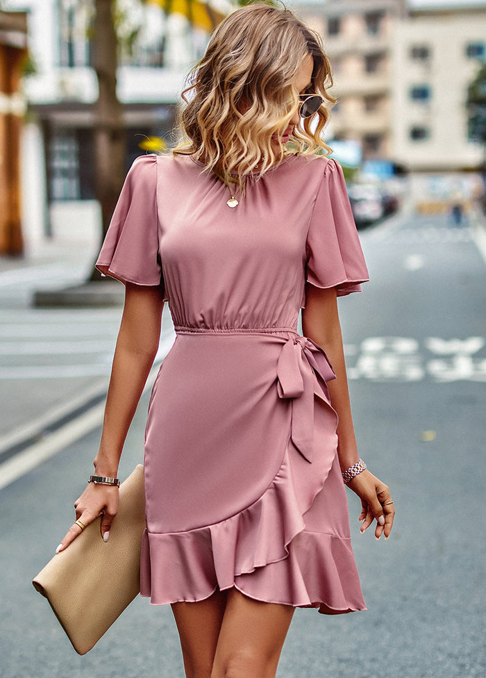 This women's solid color, sophisticated round neck ruffled dress showcases a stylish silhouette crafted from soft and comfortable fabric. Perfect for daily wear, dating, outings, or vacations, this elegant dress is both versatile and practical. Suitable for machine or hand washing, the fabric is designed to resist wrinkling and pilling for a polished look.