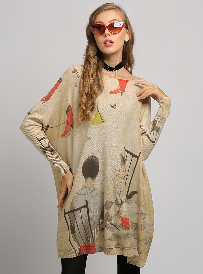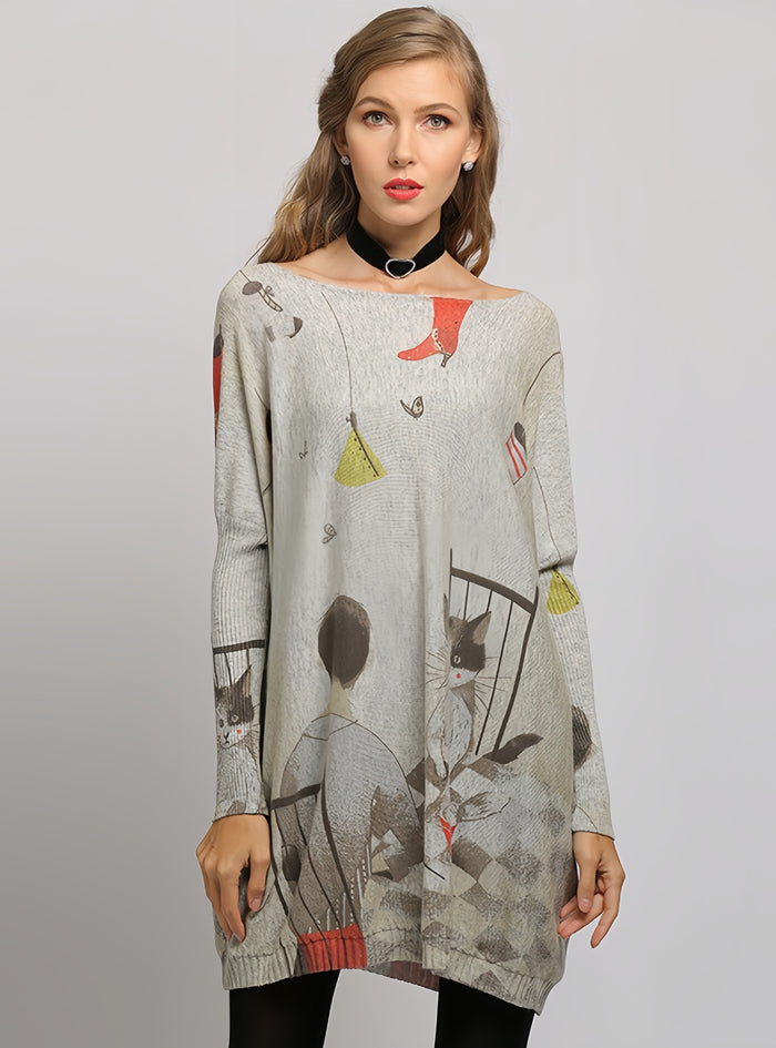Curiosity blooms with this charming dress that serves as a canvas for a playful cat illustration. The whimsical design features sketched cats and floating dresses, creating a sense of lighthearted fun. The wide neckline can be styled to drape off the shoulder for a relaxed look, and the oversized fit ensures all-day comfort. This dress is perfect for those who love to combine their love for pets with their fashion sense. Whether you're lounging at home or stepping out for a casual outing, this dress promises comfort with a hint of feline finesse.