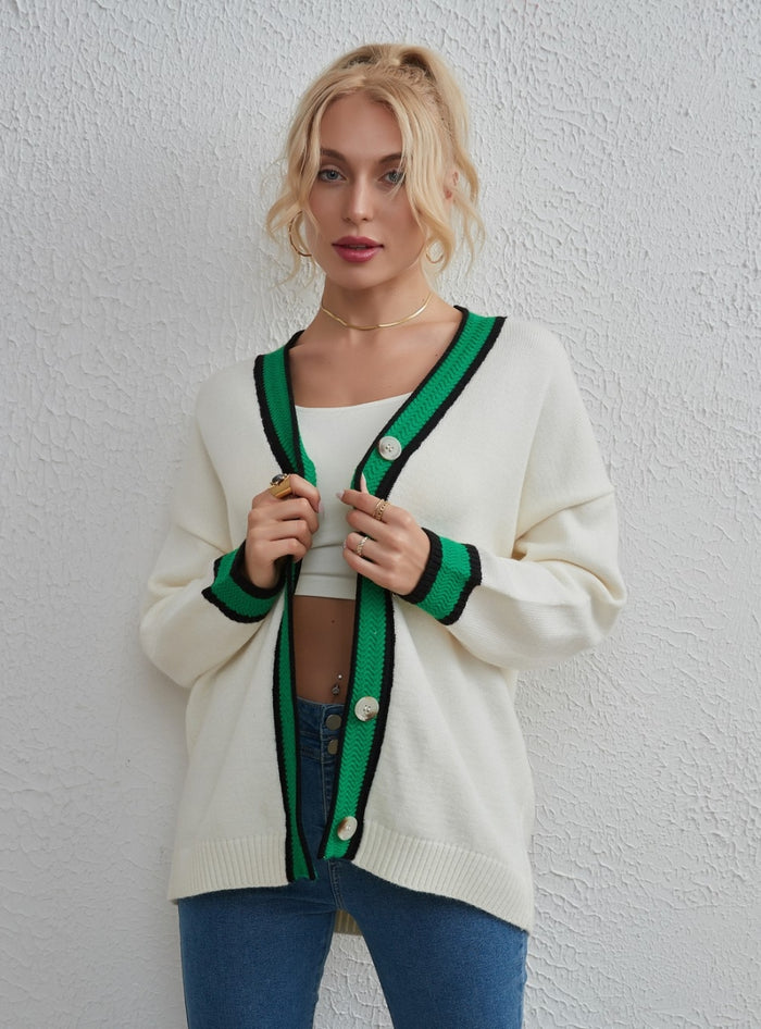 Stoke the embers and snuggle up in the Cozy Retreat White and Blue Color-Matching V-Neck Cardigan! This indispensable piece is crafted from a blend of plush knits, creating a loose and luxurious silhouette that is perfect for the chillier months. Long sleeves with relaxed drop shoulders lead down to a V-neckline, made even more captivating with a unique color-matching design. The white and blue hues blend seamlessly, highlighted by functional front buttons and a ribbed knit hem that ties the whole look together.