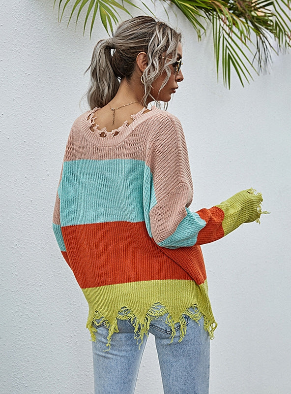 Cut Sringed V-neck Color Matching Sweater