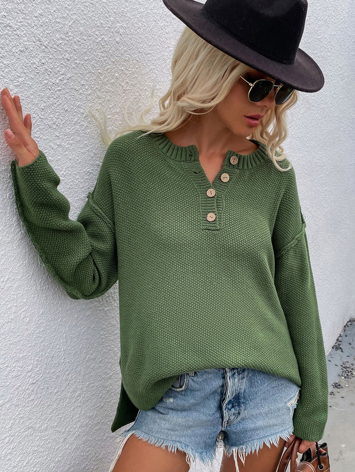 The V-neck collar brings an element of timeless elegance to this pullover, perfectly complementing the button detailing. Coupled with the loose-type version, the neckline helps create a relaxed yet refined appearance, making it a must-have addition to your wardrobe, irrespective of the season.