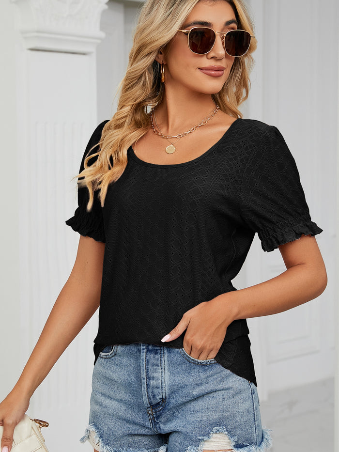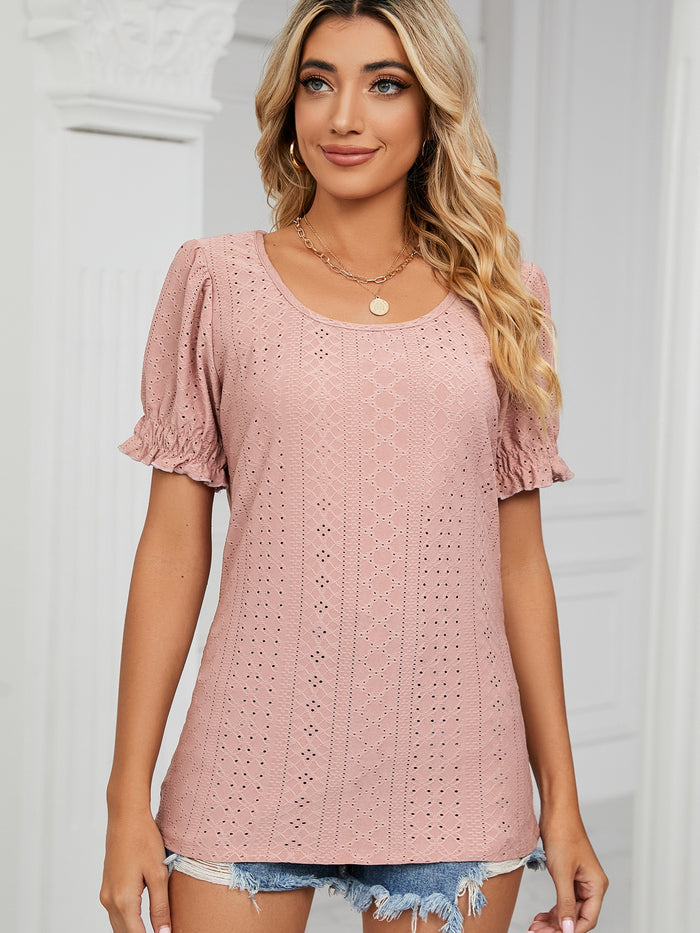 Relive cherished moments over and over again in the Lilacoo Enchanting Dusty Pink Hollow Out Short Sleeve Blouse! This lightweight, breezy tunic is perfect for the summer season, featuring a delicate plain color design that exudes effortless style. The blouse is crafted with a flattering split neckline and elegant bishop sleeves, adding a touch of romance to your casual everyday look. Designed for comfort, the loose-fitting tunic falls gracefully around the body, making it a versatile addition to your wardrobe.