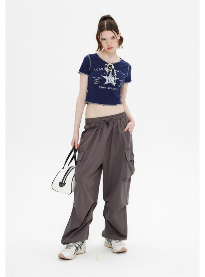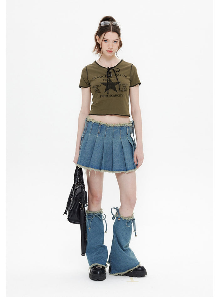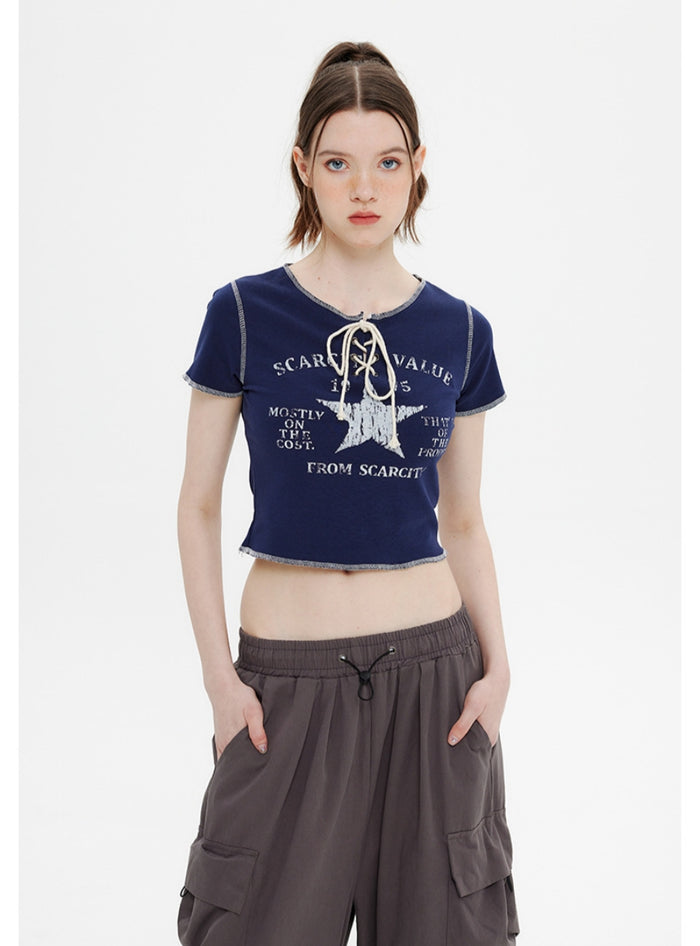 Beyond basic, this t-shirt transforms casual wear into a canvas for self-expression. Its rich olive hue and thought-provoking print make it a standout piece in any wardrobe. The playful lace-up neckline and raw, cropped hem inject a dose of rebellious spirit into the classic tee silhouette. Whether you're off to a cafe or a concert, this shirt pairs effortlessly with denim for a look that's both comfortable and conversation-starting.