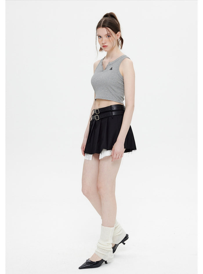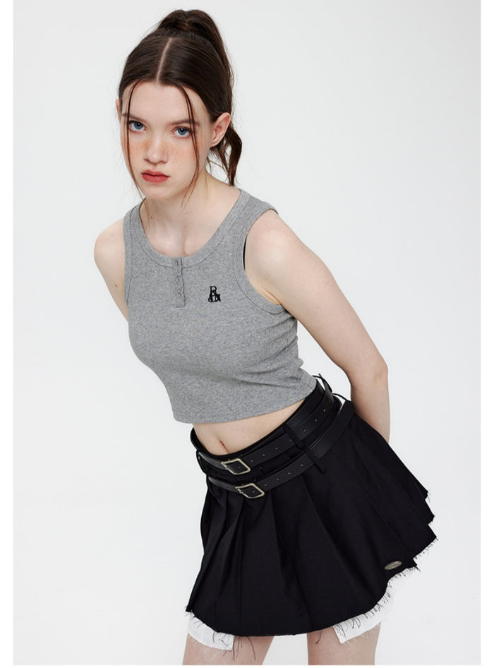 Define your style with this dazzling white cropped tank top, designed for those who appreciate a blend of classic simplicity and modern flair. The crisp white hue is complemented by a playful row of buttons, adding a hint of charm to the clean design. This top features a subtle yet stylish monogram near the hem, elevating it from basic to chic. Its snug fit and breathable fabric make it an ideal choice for a hot summer day or for layering under a jacket for an evening out.