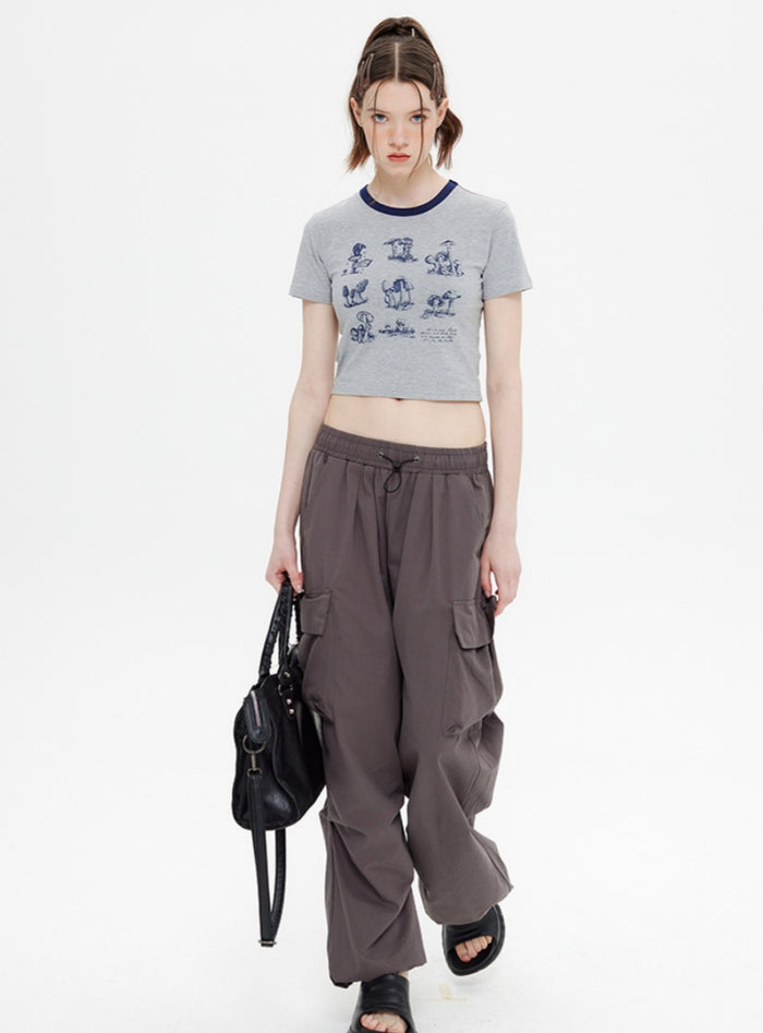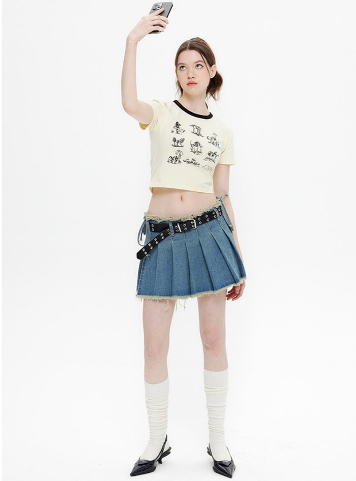 Garlanded across the fabric, the playful sketches on this t-shirt offer a delightful twist to the conventional tee. Set against a deep navy backdrop, the white collar detail frames the face, adding a dash of brightness to the design. The shirt is cut from a quality cotton blend that promises to hold its shape and color through wash and wear. The crop top style invites a breezy feel for warmer days or can be layered during cooler seasons. With its blend of comfort and character, this t-shirt is sure to become a beloved item in your casualwear rotation.