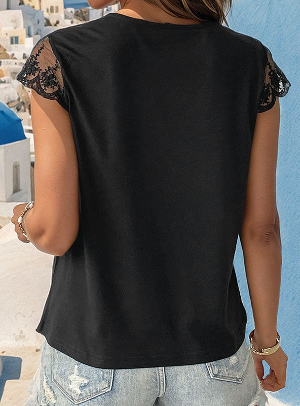 Adorned with delicate lace, this black top is the epitome of elegance and versatility. The beautifully crafted lace trim around the V-neckline and cap sleeves adds a feminine touch that enhances the overall look. The soft, breathable fabric ensures you stay comfortable throughout the day, making it perfect for both casual and formal settings. Pair it with your favorite jeans for a chic, everyday outfit or dress it up with a skirt and heels for a more sophisticated appearance. The high-quality construction and timeless design make this top a reliable choice for any season. Elevate your style with this stunning lace-trimmed top that combines classic elegance with modern comfort.