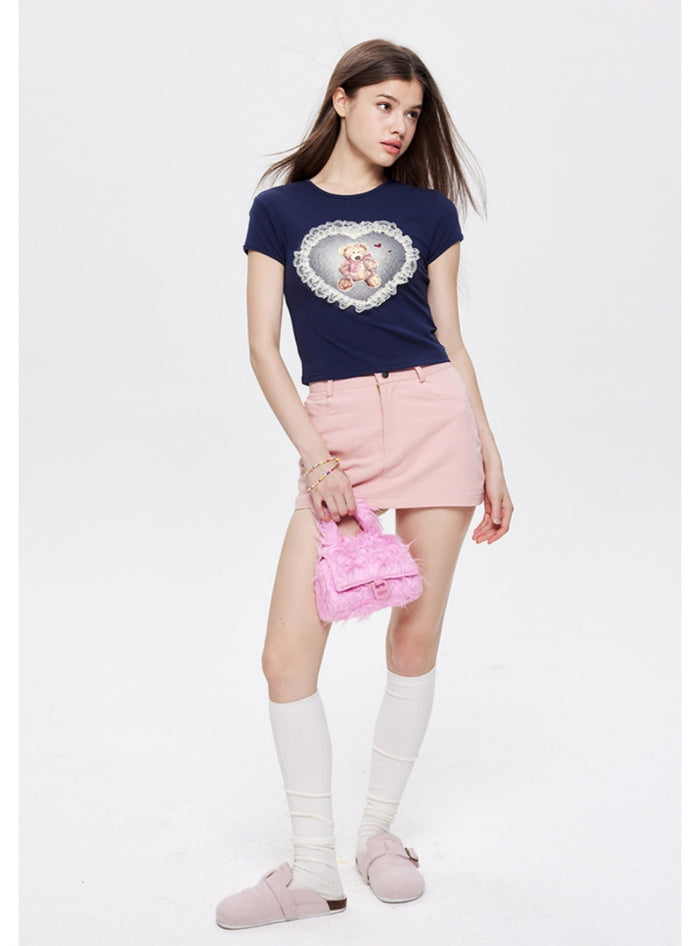 Don this dreamy t-shirt and embrace a blend of comfort and cute. The central teddy bear graphic, encircled by a delicate lace heart, gives off a vibe of playful romance, making it a perfect piece for those who like their style with a dose of adorable. The classic navy hue ensures it can be paired with numerous pieces, from pastel shorts to dark-wash denim, making it as versatile as it is sweet. It's a t-shirt that represents more than fashion; it's a feeling, a memory, a dreamy escape.