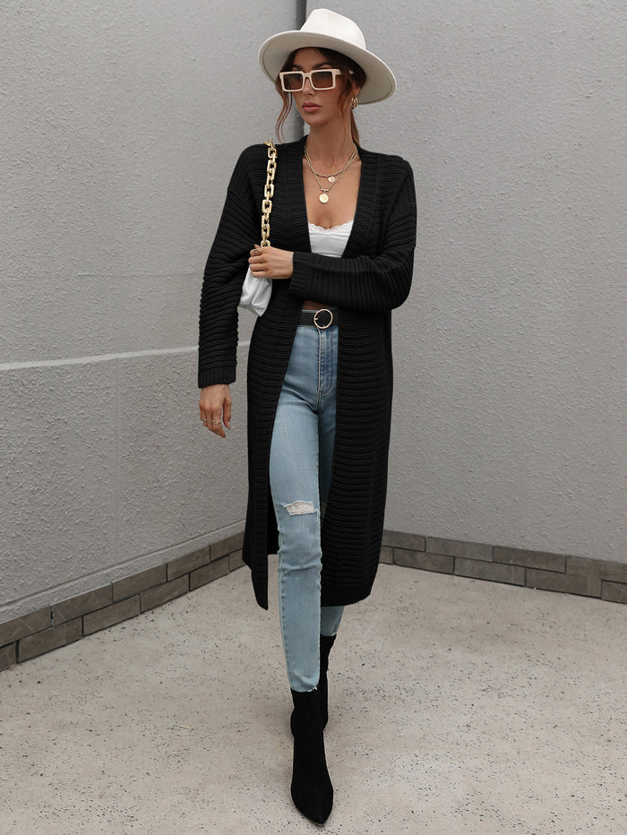 Our black round-neck cardigan sets a new standard for softness. This piece is like that first sip of coffee in the morning—smooth, comforting, and exactly what you needed. Crafted from knitting fabric, it’s a lightweight and breathable addition to your wardrobe. With its long, conventional sleeves and easy-open front, you'll find endless ways to style it. The splicing and collage techniques lend a contemporary vibe to this ordinary-length cardigan.