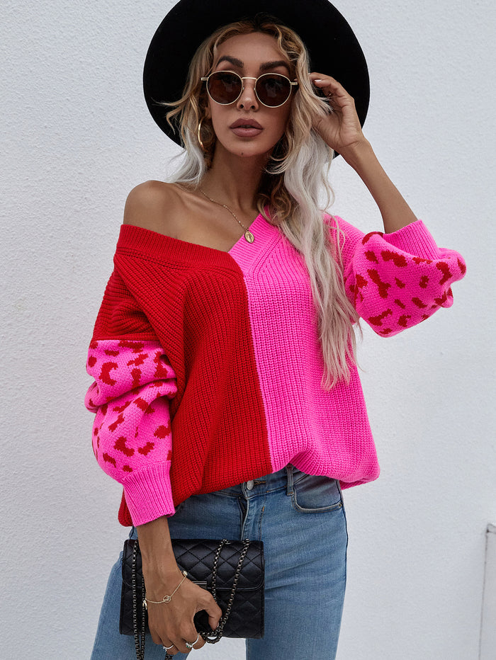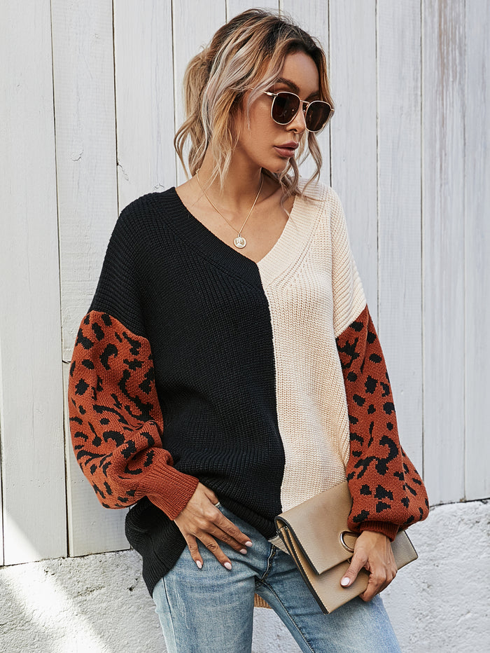 Loose V-neck Splicing Leopard Print Pullover Sweater