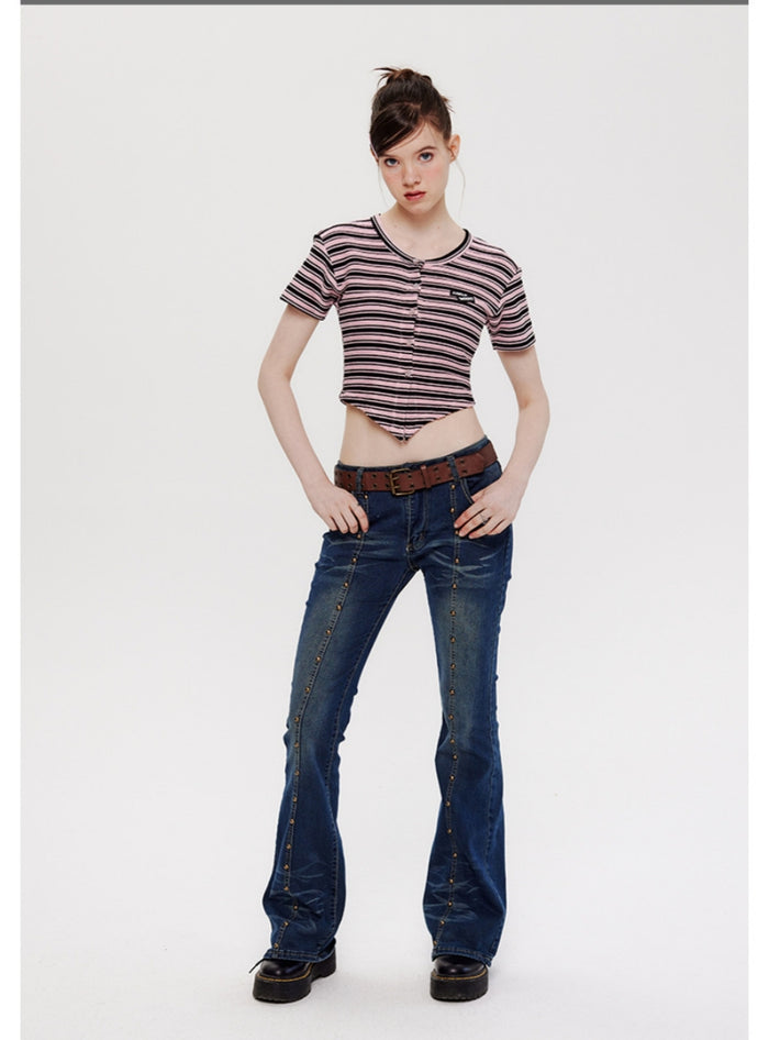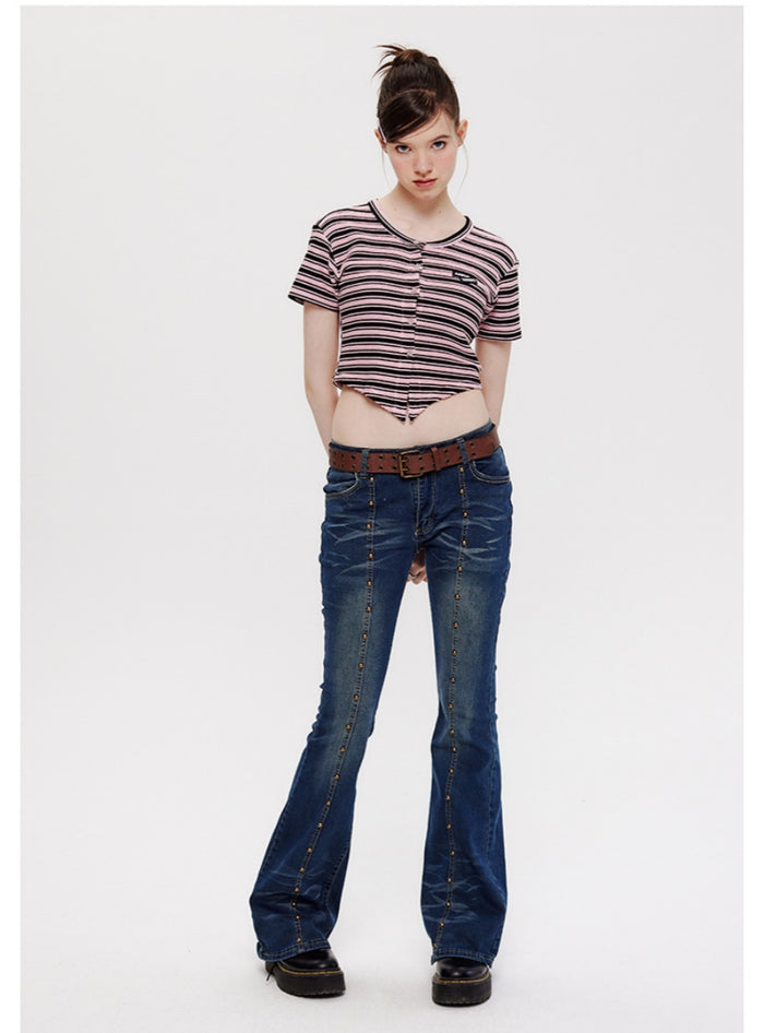 Burst onto the scene with boutique chic in this playful striped t-shirt. The black and white stripes make a bold statement, while the front button details add a unique fashion-forward touch. The cropped cut allows you to show off your midriff with confidence, and the soft, stretchable fabric offers all-day comfort. Whether you're heading to a casual lunch or an evening out with friends, this tee is sure to turn heads and become a beloved staple in your wardrobe.