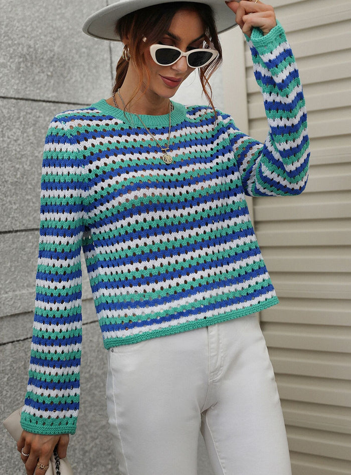 The quintessential transitional piece has arrived in this black striped sweater. With its round neck and long sleeves, it’s as plush and cozy as it is wearable. The knitting material promises breathability, allowing for year-round comfort. Whether layered in winter or worn alone in spring, this versatile piece stands the test of time and temperature, making it an absolute must-have for your ever-evolving style journey.