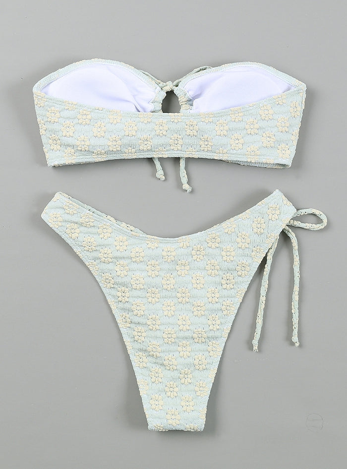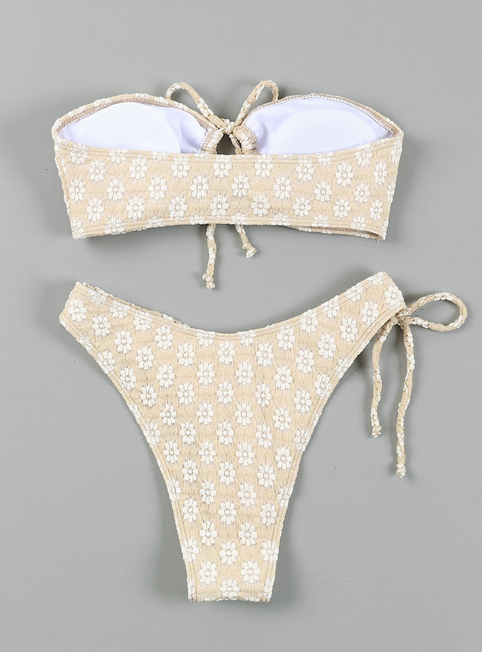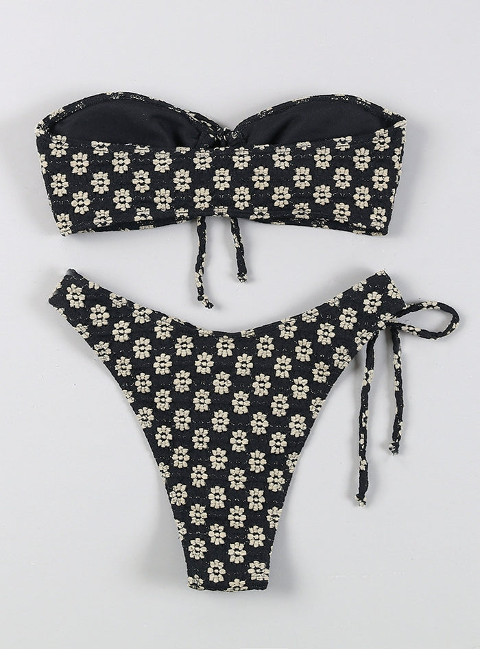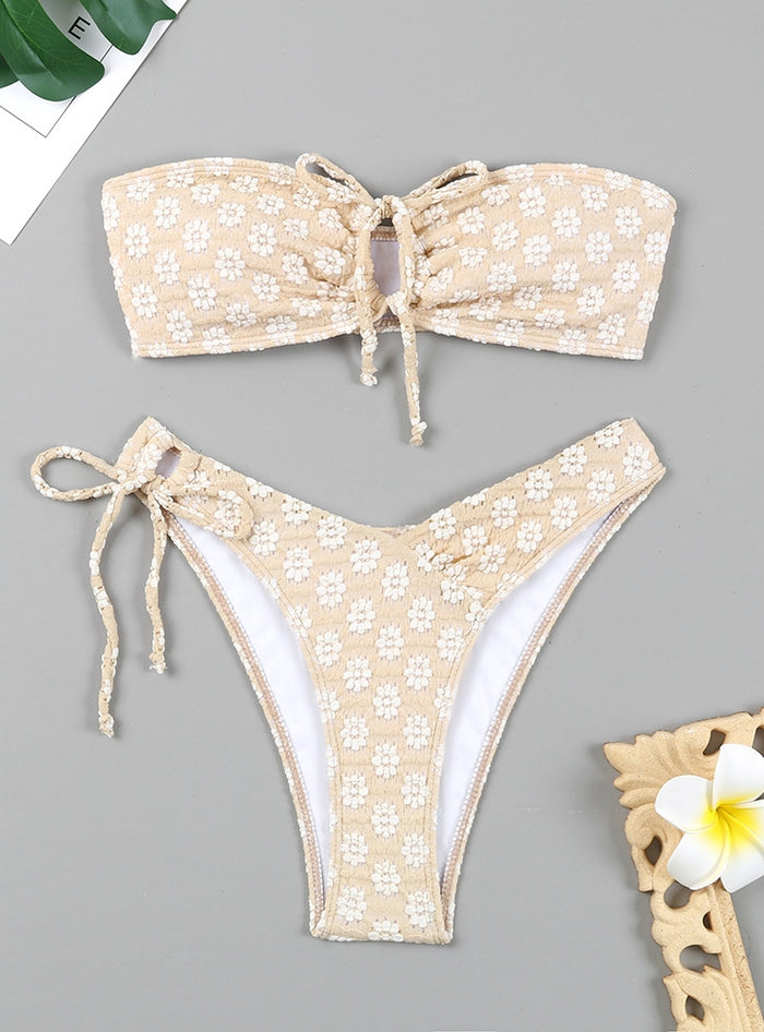 Fill your summer days with style and grace with this exquisite floral bikini, perfect for any beach outing. The bandeau top is designed with a ruched center and tie detail, offering a customizable fit that ensures you feel both secure and stylish. The top’s elegant design enhances your natural shape, providing a flattering and chic look. The matching bikini bottoms feature high-cut sides and adjustable ties, allowing you to find the perfect fit that accentuates your curves. Crafted from premium, quick-drying fabric, this bikini is ideal for all your water activities and sunbathing sessions. The delicate floral pattern in pastel hues adds a touch of charm and sophistication, making this bikini a standout piece in any swimwear collection. Perfect for those who value both style and comfort, this bikini is an excellent choice for your summer adventures. Enjoy the blend of elegance and functionality with this stunning bikini.
