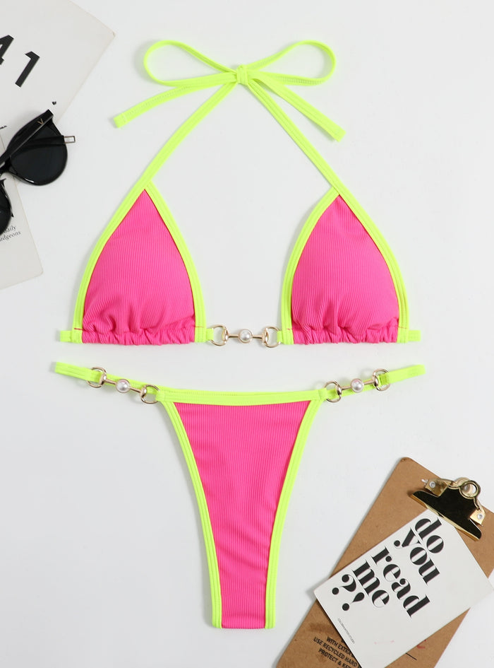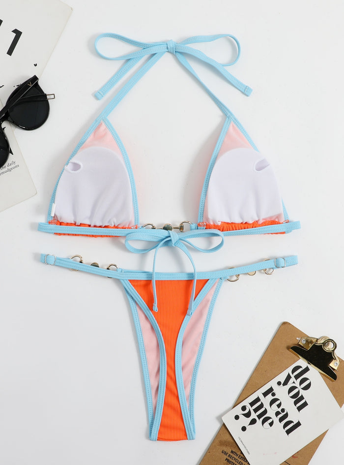 Gift yourself the ultimate in stylish swimwear with this vibrant bikini set, perfect for making a bold and beautiful statement. Featuring a striking orange and blue color scheme, this bikini is designed to catch the eye. The triangle top comes with adjustable ties at the neck and back, providing a customizable fit that ensures maximum comfort and support. The luxurious pearl and gold ring accents add an elegant touch, making this bikini set both fashionable and unique. The matching bottoms also feature adjustable side ties with pearl and gold ring details, offering a secure fit that flatters your figure. Crafted from high-quality fabric, this bikini set offers excellent resistance to fading and stretching, making it ideal for both beach and pool use. Perfect for any sun-drenched adventure, this bikini set combines style and practicality effortlessly, ensuring you look and feel your best.