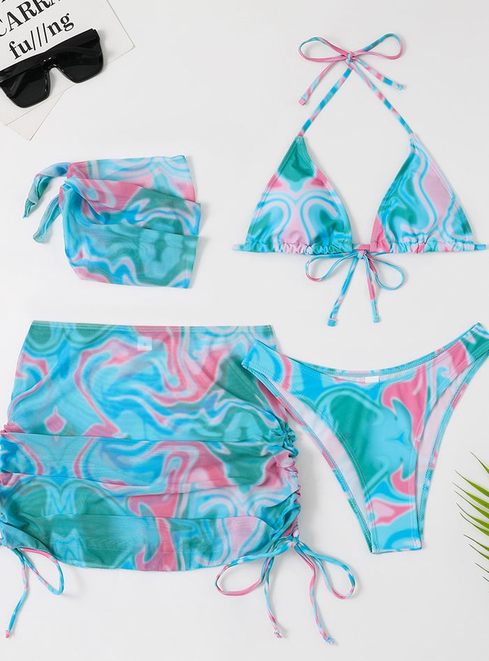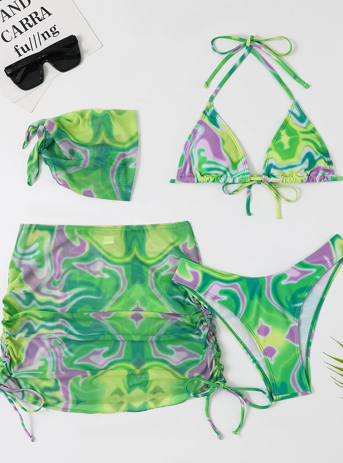 Glow with confidence in this stunning bikini set, designed to offer both style and comfort for your beach adventures. The set includes a triangle bikini top, high-cut bottoms, and a matching sarong skirt, creating a cohesive and fashionable look. The triangle top features adjustable ties at the neck and back, allowing for a secure and personalized fit. The high-cut bikini bottoms provide a flattering silhouette, accentuating your legs and curves beautifully. The matching sarong skirt adds an extra layer of style and versatility, perfect for covering up while still looking chic. Made from premium, quick-drying fabric, this bikini set is ideal for both lounging by the pool and active beach outings. The vibrant, multicolored pattern is playful and trendy, making this set a standout piece in any swimwear collection. Perfect for those who appreciate a blend of modern design and classic comfort, this bikini set is an excellent addition to your summer wardrobe.