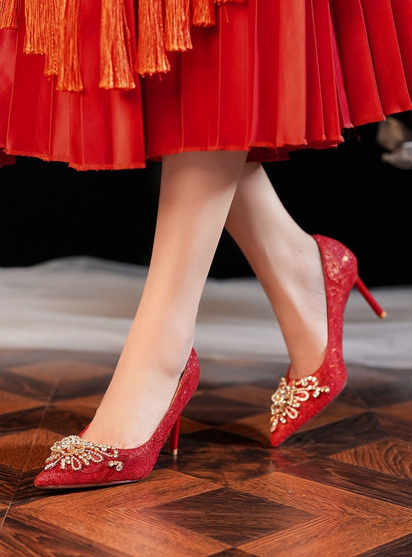 Revel in opulence with these breathtaking red lace heels that promise to elevate your prom ensemble. The intricate lace detailing, paired with the pointed-toe design, creates a truly luxurious silhouette. A sparkling gold and crystal brooch embellishes the toe, adding a regal touch that draws the eye and makes these heels a statement piece. The stiletto heel is perfectly balanced to give you both elegance and comfort, allowing you to glide through the night effortlessly. Whether you're looking to complement a bold gown or add sophistication to a simpler look, these heels are the epitome of timeless beauty. Could these be the shoes that make your prom night unforgettable?