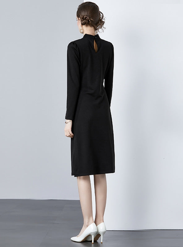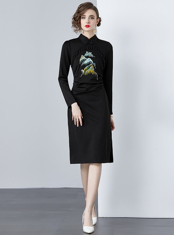 Embellished with an exquisite embroidered peacock, this black midi dress captures the essence of sophistication with a touch of the avant-garde. Its high collar and long sleeves provide a canvas of classic elegance, while the intricate peacock design injects a bold statement of individuality. Made from a luxurious, smooth fabric that skims the body, the dress is as comfortable as it is striking. The tailored fit accentuates the waist and flows into a sleek skirt that falls just below the knee, perfect for transitioning from day to evening wear. This dress is ideal for those who seek a unique piece that balances traditional style with an artistic flair.