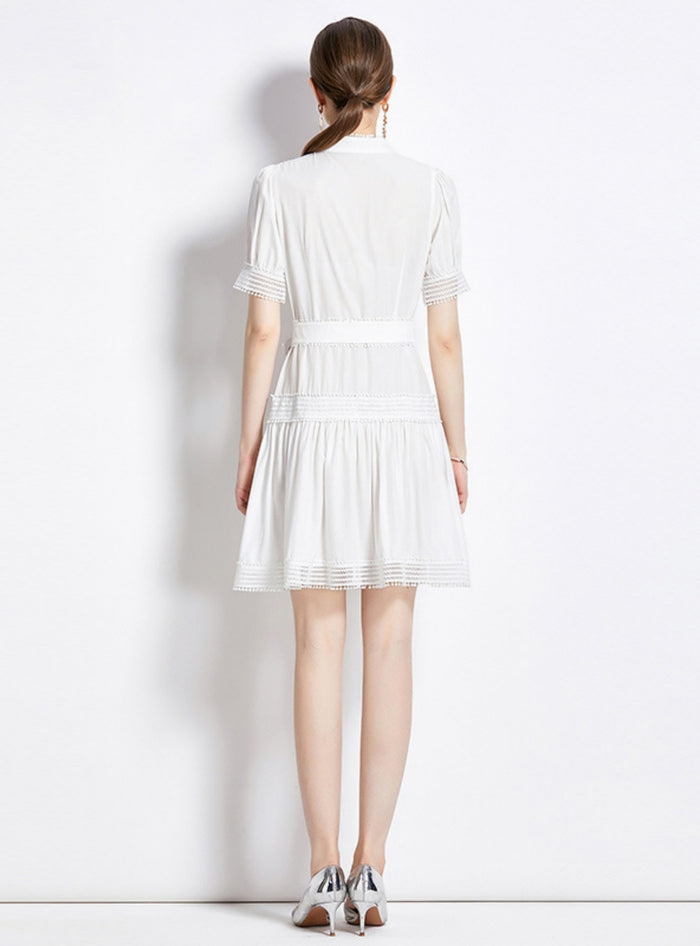 This radiant white piece is your gateway to an effortlessly elegant style. The dress features a distinct standing collar and short, regular sleeves that lend it a timeless allure. Its mini skirt with a flounce design and a striking hollow hem create an exquisite silhouette that highlights your figure. The pearls front button detailing adds a touch of luxe to this elegant piece, amplifying its beauty. This short-sleeved stunner is the epitome of feminine charm and grace. Style it with knee-high boots, a chic mini bag, and gold hoops for a head-turning look that's perfect for any occasion. This dress is all you need to stay on top of the style game this season.