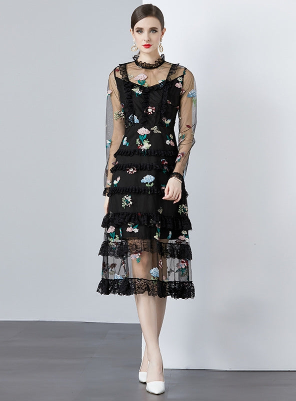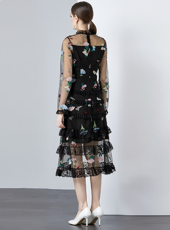 Entice the eye with this enchanting tiered lace dress, a masterpiece of delicate craftsmanship and whimsical design. The sheer overlay is adorned with an array of hand-applied flowers and sparkling embellishments that bring a garden to life on fabric. Each tier of the skirt adds a layer of ethereal grace, creating soft movement with every step you take. The dress's silhouette is thoughtfully designed to flatter, with a cinched waist and a neckline that frames the face. This dress is a dream come true for those seeking to captivate at a gala, wedding, or any formal event where enchantment is the dress code.