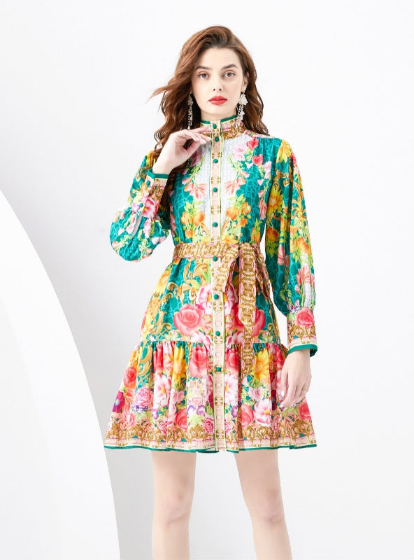 Colorful Crescendo: Immerse yourself in a symphony of color with this vibrant dress, a piece that’s as much a work of art as it is a statement in fashion. The vivid floral print bursts with life, invoking the essence of a sun-drenched garden in full bloom. Featuring a high neckline and long sleeves, the dress balances its boldness with a touch of classical sophistication. The waist is cinched with a coordinating belt, highlighting the figure and leading into a playful, flared skirt that falls charmingly above the knee. Ideal for those who wish to bring brightness to their day-to-day attire or for making an entrance at a celebratory event, it’s a dress that won’t be forgotten.