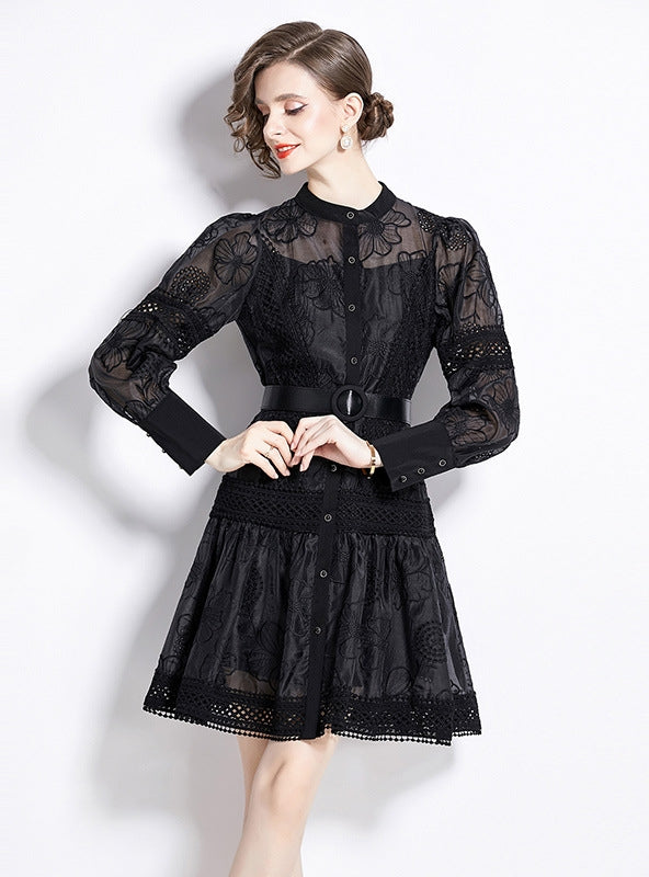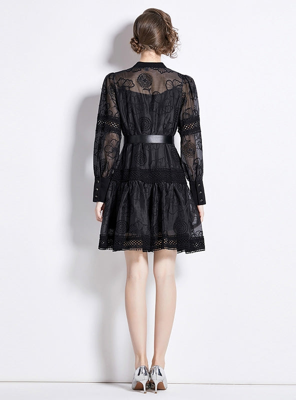 Majestic in black, this enchanting dress weaves a story of elegance with its intricate lace and delicate detailing. Its sheer fabric and full sleeves whisper of vintage charm, while the solid black underlay ensures modesty and sophistication. A cinched waist highlighted by a sleek belt carves a silhouette that is at once classic and contemporary. With a skirt that playfully flares just above the knee, this dress promises to sway with an ethereal grace at every turn. The high collar adds a touch of regality, perfect for evenings where a touch of gothic glamour is de rigueur. Pair it with heels for a lift or with boots for an edgier look, this dress is versatile enough to traverse from daywear to evening sophistication.