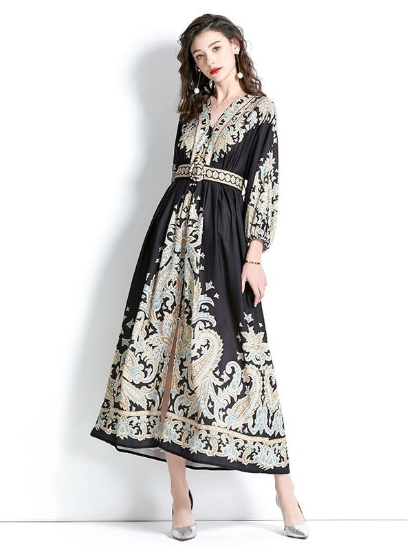 Heritage and high fashion converge in this full-length dress, where grand baroque motifs make a striking statement against a pure black canvas. The dress features a V-neckline that adds a modern sensibility, and the wide belt cinches the waist for a flattering profile. Designed for the discerning woman, this dress is a testament to the timeless allure of intricate patterns and the enduring appeal of a classic silhouette.
