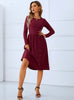 Red Round Neck Long Sleeve Pleated Button Dress