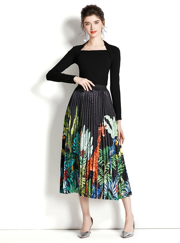 Retro Square Neck Long Sleeve Top+Printed Pleated Skirt Suit