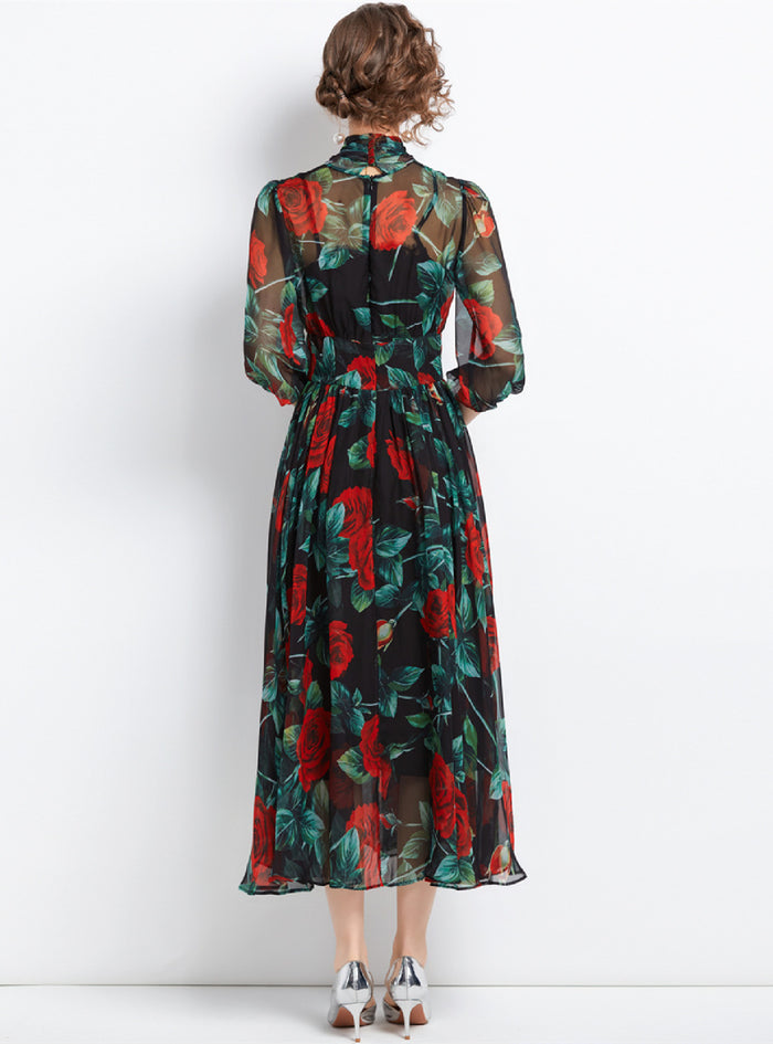 Rose Printed Slim Long Sleeve Chiffon Dress