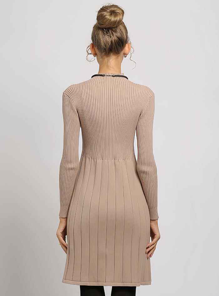 Dress to impress with this sophisticated knit dress, perfect for cooler weather. The dress features a snug ribbed turtleneck for warmth and a cinched waist that flares into a delicate pleated skirt for a touch of femininity. The neutral color palette lends itself to a variety of accessorizing options – pair with bold jewelry and heels for an evening out, or keep it simple with flats and minimal accessories for daytime elegance.